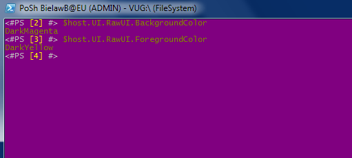 Nie regulujcie odbiorników. Wiem, u Was wygląda to zdecydowanie inaczej. Przyczyna? Domyślny skrót do PowerShell.exe ma pozmienianie wartość RGB kolorów podstawowych, więc DarkMagenta może i jest nawet Dark, ale na pewno daleko mu do Magenta. O zażółceniu DarkYellow nawet nie wspominam… 😉