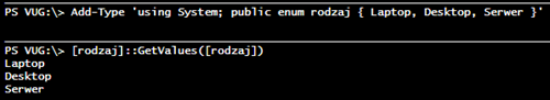 Pozostaje trzymać również trzymać kciuki…? Na szczęście możemy zrobić nieco więcej: w PowerShellu możemy dość łatwo dodać słowo kluczowe ‘enum’, dzięki któremu sami będziemy mogli tworzyć typy wyliczeniowe w sposób analogiczny do tego, w jaki tworzy się je w C#: