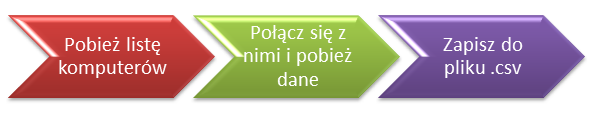 Naturalna kolej rzeczy: nasz skrypt może przyjąć jako parametr samą listę (przekazaną przez rurkę), OU w AD, plik txt/ csv z listą komputerów itd. Na wyjściu – podamy ścieżkę do pliku .csv w którym dane zostaną zapisane. To co się dzieje w środku zależy już od nas. Możemy więc albo zrobić to w formie funkcji, które następnie ustawimy w jednej “rurce” i uzyskamy pożądanych efekt. Albo wszystko zrobić za jednym zamachem, bez dziabania kodu na poszczególne fragmenty. Co tracimy?