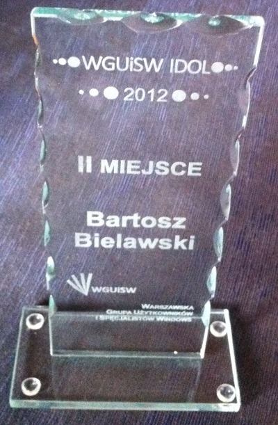 Wczoraj nastąpiło rozstrzygnięcie konkursu WGUiSW Idol. I nie powiem, miło mnie zaskoczyły jego wyniki. Oczywiście, pochlebne opinie mojej żony i mojego mentora “na gorąco” pozwalały wierzyć, że uzyskam jakąś dobrą notę, ale nawet wtedy nie sądziłem, że będzie ona aż tak wysoka (jeśli dobrze zarejestrowałem uzyskałem 8.25/10). Tym bardziej nie sądziłem, że do ostatniej chwili będę miał szansę na zwycięstwo. Naturalnie: bycie drugim ma też swoje minusy (świadomość, że zwycięstwo było tak blisko a jednak się nie udało). Na szczęście, widziałem tę szansę tylko przez dłuuuuuugie (subiektywnie długie, zgodnie z zasadą dotyczącą drzwi od toalety…