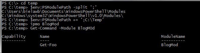 Moduły można, jak widać na załączonym zrzucie ekranu, importować bez większego trudu z dowolnego miejsca na dysku. Istnieje jednak zmienna środowiskowa, która definiuje kilka folderów, z których import będzie o wiele prostszy. PSModulePath przypomina nieco zmienną PATH: ma identyczną składnię, lista folderów jest rozdzielona średnikami: