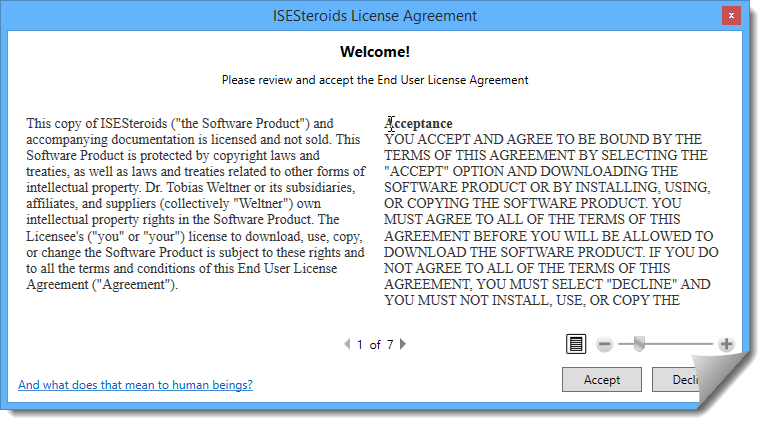 Przyznam, że w przeszłości próbowałem (i nadal zdarza mi się) pisywać rozszerzenia do ISE. Nie spodziewałem się jednak, że ingerencja w produkt może sięgnąć tak daleko. Dodatek ISESteroids zmienia wygląd i zachowanie ISE w sposób zasadniczy. Instalacja jest dość prosta: ISESteroids to po prostu moduł, który musimy pobrać, a następnie rozpakować w odpowiedniej lokalizacji. Uruchomimy go przy pomocy polecenia Start-Steroids. Przy pierwszym uruchomieniu zostaniemy poproszeni o zaakceptowanie umowy licencyjnej: