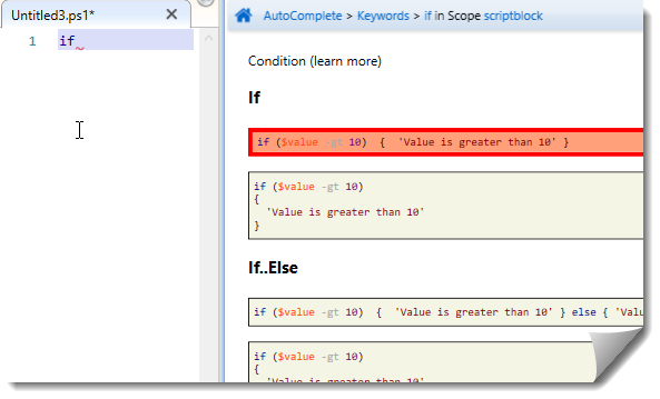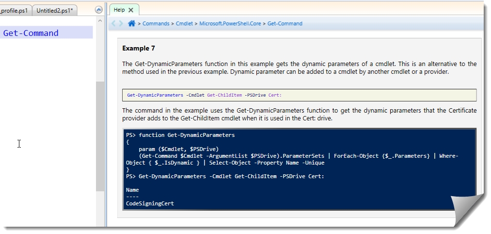 O wiele ciekawsze rozszerzenie to aktywna pomoc. W dodatku jest to chyba najbardziej przejrzyście prezentowana pomoc dla PowerShella. Nie musimy nawet wymuszać wyświetlania pomocy, wystarczy ustawić kursor w odpowiednim miejscu: