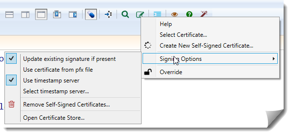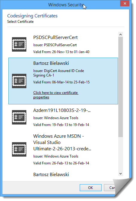 Jedną z rzeczy, których zawsze brakowało mi w ISE była możliwość prostego podpisywania skryptów odpowiednim certyfikatem. ISESteroids znacznie to ułatwia. Nie tylko możemy wybrać w prosty sposób stosowny certyfikat: