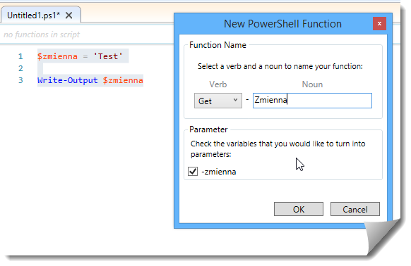function Get-Zmienna { <# .Synopsis Short Description .DESCRIPTION Detailed Description .EXAMPLE Get-Zmienna explains how to use the command can be multiple lines .EXAMPLE Get-Zmienna another example can have as many examples as you like #> [CmdletBinding()] param ( [Parameter(Mandatory=$false,Position=0)] [System.String] $zmienna = 'Test' ) Write-Output $zmienna }