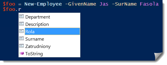 ”OutputType” działa zgodnie z przewidywaniami. Pisząc skrypt, nawet bez jego uprzedniego uruchamiania, uzyskamy podpowiedzi odnośnie dostępnych właściwości: