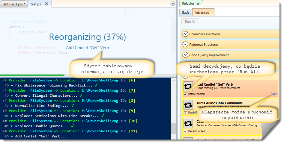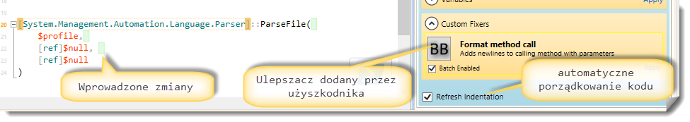 Po zakończeniu zmian, wszystkie elementy, które uległy zmianie są odpowiednio “podkreślone”. Można automatycznie poprawić wcięcia w kodzie po zakończeniu wszystkich operacji, dzięki czemu same “ulepszacze” nie muszą się tym zajmować, skupiając się na zmianach bardziej szczegółowych: