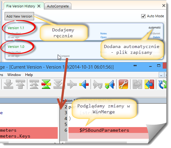 Osobiście z dodatku tego nie będę korzystał – stosuję na co dzień gita i nie ukrywam, że choć czasem rwę włosy z głowy, to wolę jednak rozwiązania, które są bardziej “powszechne” i nie ograniczają się tylko do PowerShella. Nie da się jednak ukryć, że narzędzie wbudowane w ISESteroids daje już pewną kontrolę nad skryptami. W dodatku, można w nim włączyć opcję automatycznego wersjonowania, która “mniejsze” wersje skryptu będzie dodawać sama, po każdym zapisaniu. Razem z modułem dystrybuowany jest WinMerge, więc bez trudu możemy porównać wersje i ocenić, które zmiany mogły sprawić, że nasz doskonały skrypt nagle przestał działać: