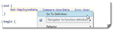 Pisząc skrypt często stosuję funkcje. Jeśli potrafię wyodrębnić jakieś logiczne operacje, szczególnie jeśli operacje te są powtarzalne, to kod umieszczam w funkcji. Bardzo lubię też skrypty budować począwszy od pojedynczej “rurki”, której elementy następnie pracowicie tworzę. Zdarza się też, że w ramach skryptu lub modułu korzystam z funkcji pomocniczych. We wszystkich tych przypadkach, w przypadku zmian, przydaje się możliwość szybkiego powrotu do miejsca, gdzie funkcja przeze mnie używana jest definiowana. W ISESteroids mamy odpowiednią funkcję w menu kontekstowym: