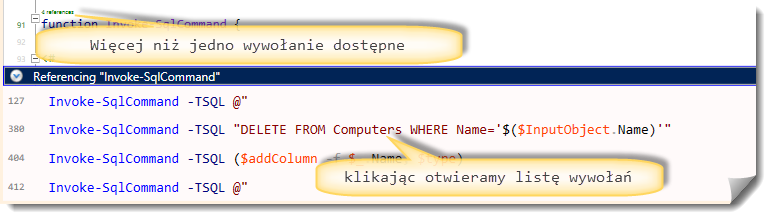 To oczywiście jedna strona medalu. W drugą stronę “wycieczka” może być równie przydatna. I tu również “sterydy” przychodzą z pomocą: jeśli funkcja jest wykorzystywana w bieżącym pliku, to zawsze mamy nad nią informację o tym. Jeśli jest wykorzystana tylko raz, to kliknięcie na referencję od razu przeniesie nas w to miejsce. Jeśli jednak ta sama funkcja jest stosowana wielokrotnie, to możemy wybrać to użycie, które nas interesuje: