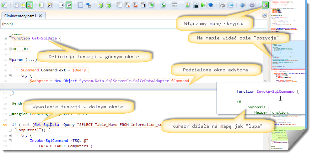 W przypadku bardzo długich skryptów docenimy z pewnością mapę skryptu, które daje nam “podgląd”, obejmujący większą całość, wraz z łatwym określeniem jaki fragment właśnie widzimy w oknie skryptu. Dodatkowa możliwość powiększenia fragmentu przez najechanie kursorem sprawia, że możemy w prosty sposób przenosić się pomiędzy sekcjami kodu. Jeśli dodatkowo włączymy rozdzielenie widoku skryptów (uzyskamy ten efekt “ciągnąc” myszką górną krawędź okna ze skryptem), to możemy uzyskać dość ciekawy efekt: