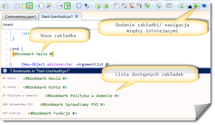 Kolejny element, dzięki któremu możemy w prosty sposób “wędrować” po dłuższym skrypcie to zakładki. Przypominają one nieco regiony z tą różnicą, że zamiast “zawijać” bloki kodu, oznaczają punkty w naszym skrypcie. Możemy w ten sposób na przykład oznaczyć te bloki kodu, w których zamierzamy coś zmienić, lub w których podejrzewamy buga. Dodawanie zakładek wymaga wprowadzenia komentarza blokowego zaczynającego się od słowa “bookmark”: