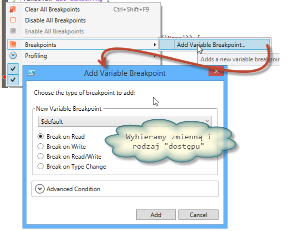 PowerShell oferował całkiem solidne wsparcie dla “odrobaczania” od wersji drugiej, włącznie z dość rozbudowanym systemem breakpointów, jednak w ISE dostępny był tylko jeden z nich: przerywający działanie skryptu w wyznaczonej linii. ISESteroids nie pozbawia nas tej możliwości, dodaje jednak opcję, której w oryginale brakuje: przerywanie działania skryptu w sytuacji, gdy wykonana zostanie operacja na jednej ze zmiennych. Ustawienia dla tych breakpointów znajdziemy klikając prawym przyciskiem na wspomnianym wcześniej marginesie debuggera: