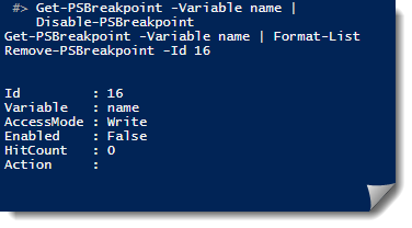 Get-PSBreakpoint -Variable name | Disable-PSBreakpoint Get-PSBreakpoint -Variable name | Format-List Remove-PSBreakpoint -Id 16