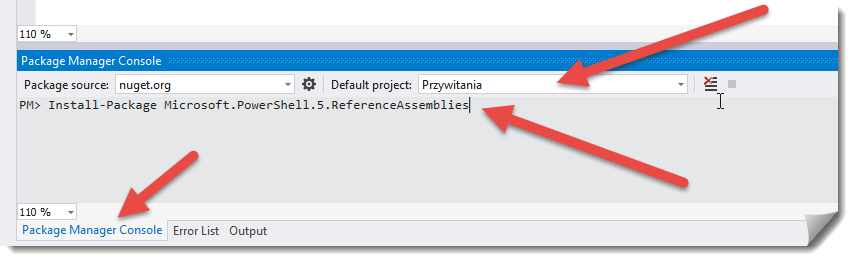Kolejna rzecz, o którą musimy zadbać, to dodać do projektu "System.Management.Automation.dll". W chwili obecnej najlepszym sposobem osiągnięcia tego celu jest zainstalowanie odpowiedniego pakietu NuGet: