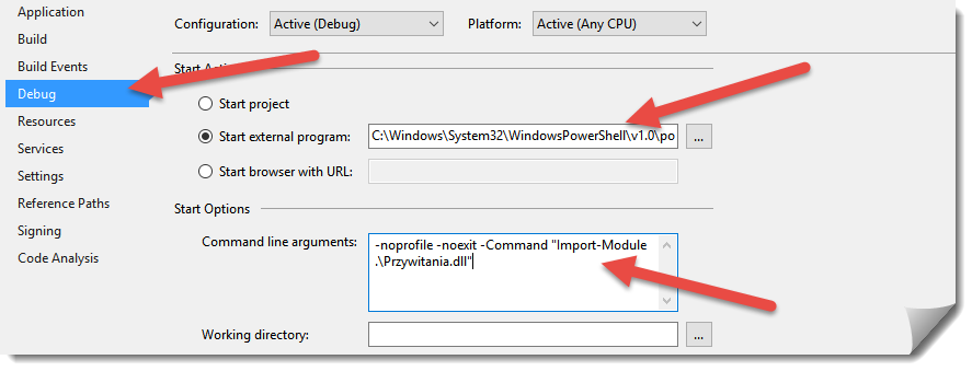 Precyzujemy więc, że uruchamiać będziemy PowerShella, a wśród parametrów skorzystamy z opcji NoProfile (oszczędzi nam to czekania na załadowanie wszystkich elementów naszego profilu) NoExit (dzięki czemu po wykonaniu poleceń okno pozostanie otwarte, ułatwiając nam eksperymenty) i opcji Command (w której załaduje świeżo utworzony moduł). Pozwoli nam to na dokładną analizę modułu, łącznie z wykorzystaniem punktów zatrzymania: