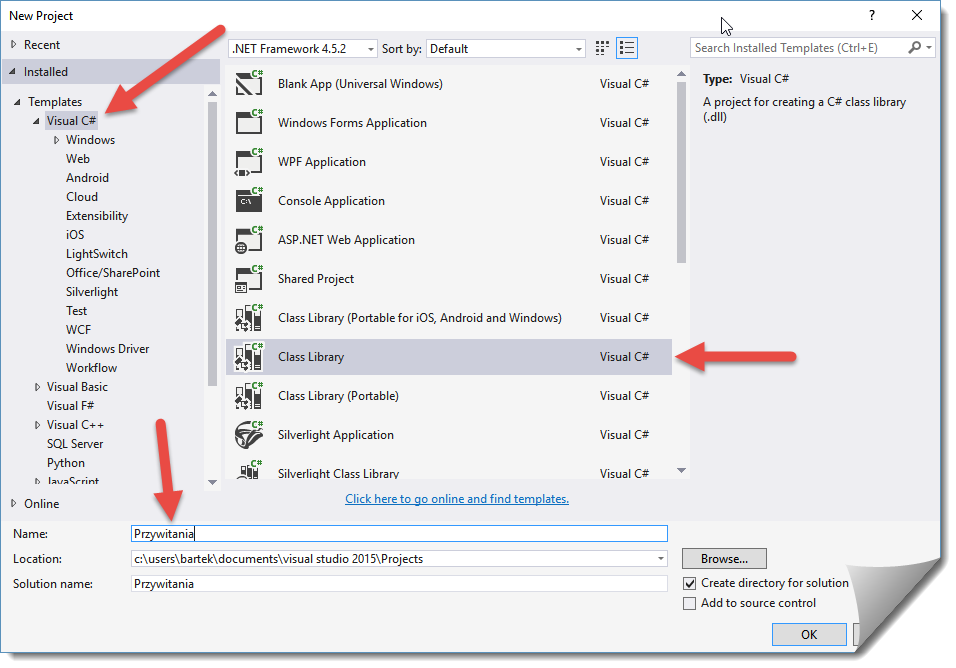 Moduł tworzyć będę w Visual Studio: pewnie da się prościej/ szybciej/ wygodniej, ale mi jakoś zawsze najłatwiej było zmusić do współpracy właśnie tę aplikację. Na początek stworzyć musimy projekt, wybierając jako nasz cel utworzenie biblioteki – tym właśnie są moduły w PowerShellu. Nazwa projektu stanie się docelowo nazwą naszego modułu.