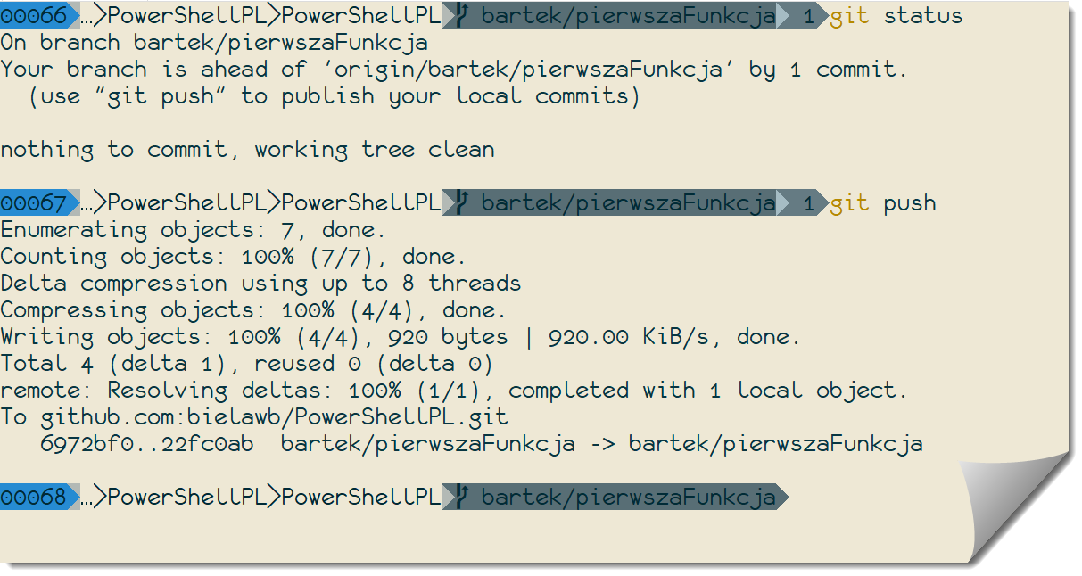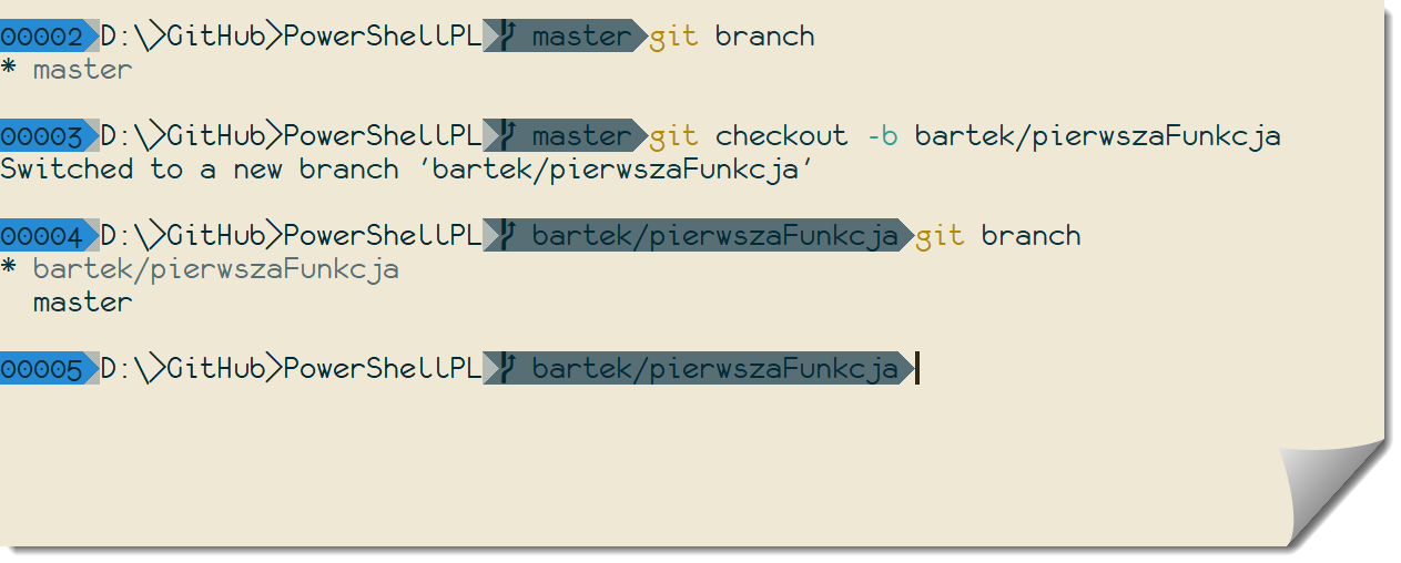 Odnośnie nazwy gałęzi: istnieje wiele szkół, na ogół połączonych z całym procesem, jakiego należałoby używać w trakcie z korzystania z nich (jak GitFlow). Osobiście nigdy nie zdecydowałem się na ścisłe stosowanie do którejkolwiek z nich. Zwykle po prostu umieszczam moje imię z opisem danej gałęzi. Może być to hasłowy opis (jak ‚pierwszaFunkcja’ widoczny powyżej). Na ogół umieszczam jednak ID w ramach systemu takiego jak JIRA.