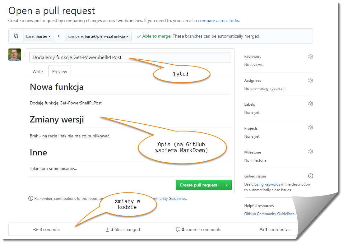 Oto jak taki Pull Request wygląda na platformie GitHub:
