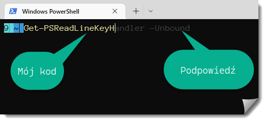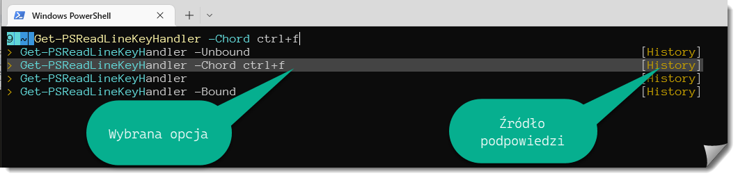 Najpierw przyjrzyjmy się opcji dostępnej zarówno dla użytkowników Windows PowerShell 5.1, jak i dla osób korzystających z PowerShell 7.1+, czyli podpowiedzi wykorzystujących historię poleceń. Włączyć ją możemy korzystając z polecenia ustawiającego opcje PSReadLine (Set-PSReadLineOption):