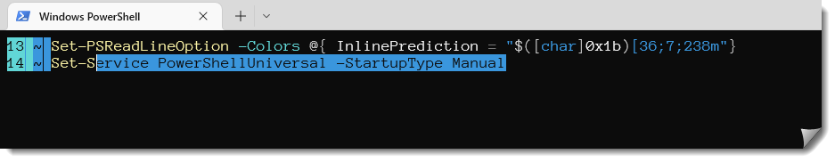 | Set-PSReadLineOption -Colors @{ InlinePrediction = "$([char]0x1b)[36;7;238m"} | |