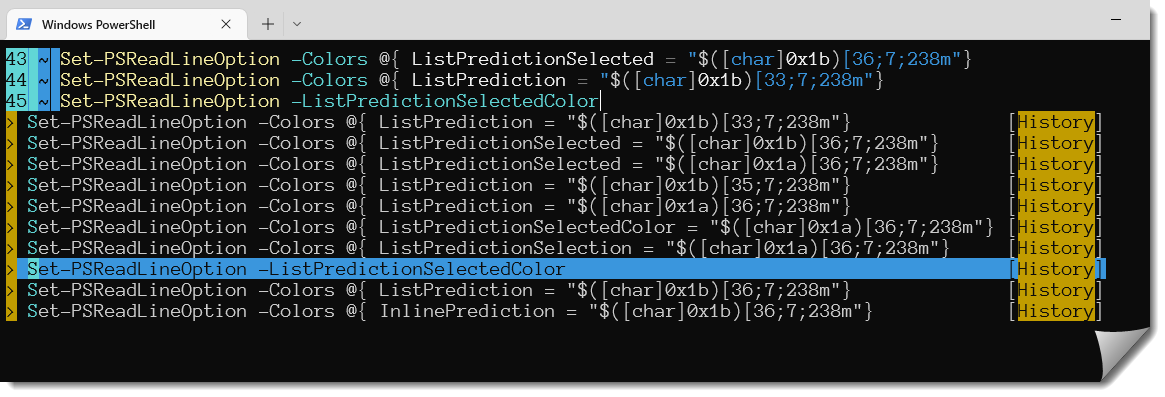 | Set-PSReadLineOption -Colors @{ ListPrediction = "$([char]0x1b)[33;7;238m"} | |