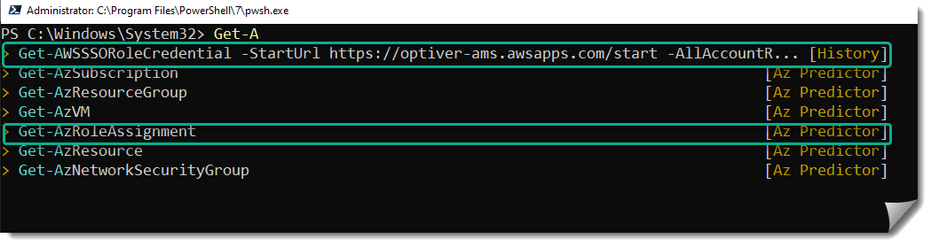 Na koniec – wisienka na torcie: w PowerShell 7.1+ możemy skorzystać z możliwości tworzenia własnych podpowiedzi. Przykładem takich podpowiedzi jest oferowany przez Azure zestaw podpowiedzi do ich poleceń w ramach modułu Az.Tools.Predictors. Po zainstalowaniu uzyskamy podpowiedzi nawet w przypadku poleceń, których nigdy nie mieliśmy okazji użyć: